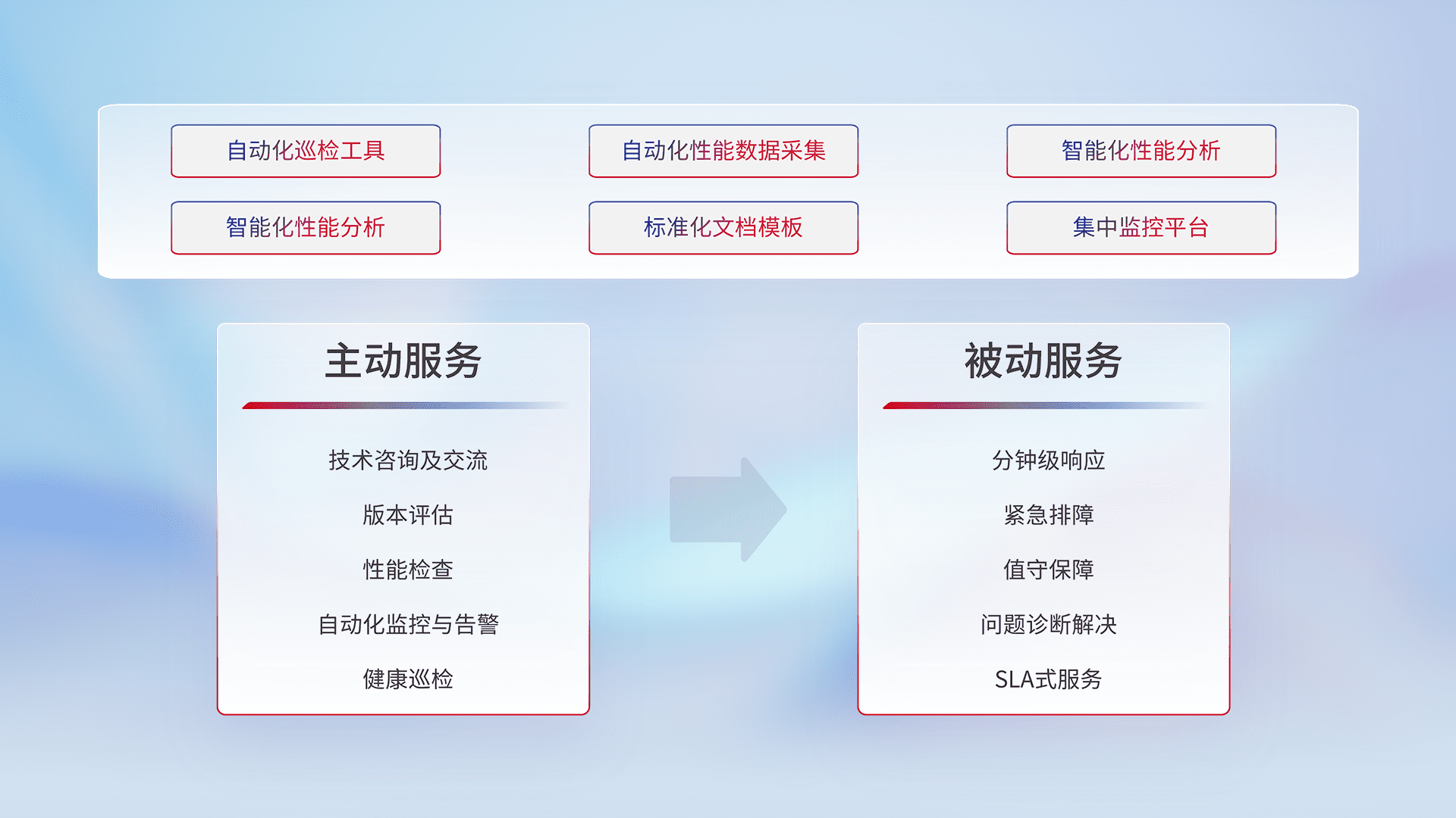 智能化工具和标准化文档,,,保障服务质量,,,提供主动服务(包含技术咨询、、、、版本评估、、性能检查、、、自动化监控与告警、、、、健康巡检)和被动服务包含(分钟级响应、、、紧急排障、、、值守保障、、、问题诊断解决、、SLA服务)。。。