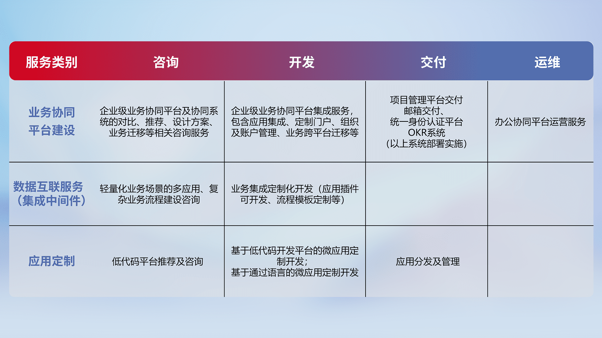 针对钉钉、、、、企微、、、、IDaas等平台级产品提供产品的规划、、、、方案、、、交付、、定制化开发等服务,,实现如统一协同办公、、智能客户服务、、、混合会议管理、、、、智能数据查询、、等业务场景,,实现数字化转型。。。